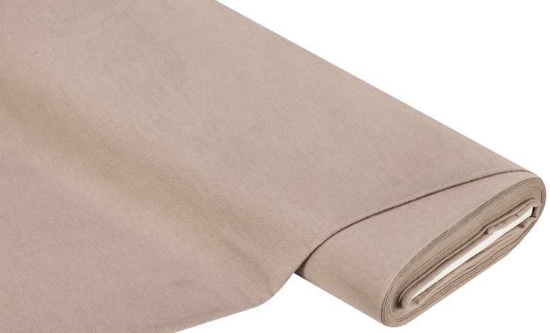 Baumwoll-Molton "Nora", Farbe: taupe, Garnanzahl: 30 x 15 (bezogen auf 1 cm²), Stärke: 1 mm, Breite: 145 cm, Gewicht: ca. 250 g/m². Einlaufwerte: ca. 8 % in Länge und Breite. Material: 100 % Baumwolle.