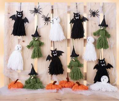 Bastel-Set Wollfiguren "Halloween", exklusiv von buttinette, zum Basteln von 16 Wollfiguren in der Größe 7–12 x 5,5–19 cm. Inhalt: 12 Wattekugeln 30 mm, 24 Wackelaugen 7 mm, 4 Knäuel Wolle á 50 g in den Farben Schwarz, Weiß, Orange, Grün, Filzstanzteile und eine Anleitung.