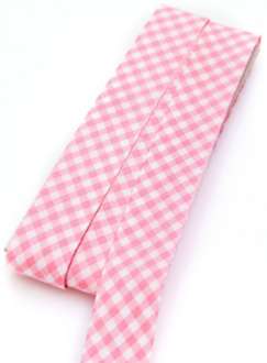 buttinette Baumwoll-Schrägband "Vichykaro", Farbe: rosa-weiß, Breite: 2 cm, von 4 cm auf 2 cm vorgefalzt, Länge: 5 m. Material: 100 % Baumwolle.