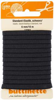 buttinette Gummiband "Standard-Elastik", Farbe: schwarz, Breite: 6 mm, Länge: 10 m. Material: 68 % Polyester, 32 % Elastodie.