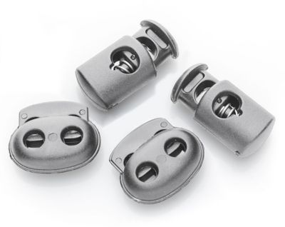 buttinette Kordelstopper-Set, Farbe: grau, Inhalt: zwei 1-Loch-Stopper für max. Kordelstärke 6 mm Ø, zwei 2-Loch-Stopper für max. Kordelstärke 5 mm Ø. Material: Kunststoff.