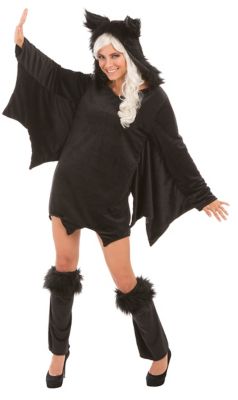 - Besonderheiten: schauriges Kleid in tiefem Schwarz mit Fledermausärmeln, Kapuze mit Fledermausohren, Kapuze und Stulpen mit Details aus Fellimitat