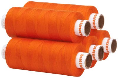 buttinette Universal-Nähgarn, Farbe: orange, Fadenstärke: 100, Nadelstärke: 60 - 100, Inhalt: 5 Spulen, 500 m pro Spule. Material: 100 % Polyester.