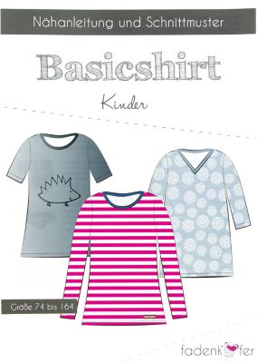 Fadenkäfer Schnitt "Basicshirt" für Kinder, Anleitung für 3 Modelle, Größe 74–164, Schwierigkeitsstufe: leicht, Stoffempfehlung: Jersey, Sweatstoff, French Terry, Nicki, elastische Stoffe.