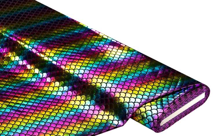 Folienjersey "Kleine Schuppen", Farbe: regenbogenfarben, Rückseite: uni schwarz, querelastisch, Schuppen quer verlaufend, Schuppengröße: 2 x 2 cm, Breite: 150 cm, Gewicht: ca. 150 g/m². Material: 100 % Polyester.