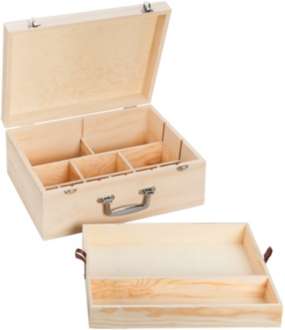 Koffer aus Holz, mit Metallgriff, zur Aufbewahrung verschiedener Utensilien, Farbe: natur, innen mit 11 fest integrierten Fächern, mit herausnehmbarem Einsatz in der Größe: 22 x 32 x 5 cm, Gesamtgröße: 35 x 25 x 15 cm. Ohne Inhalt.