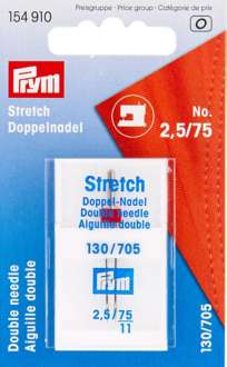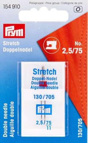 Prym Doppelnadel "Stretch" (Zwillingsnadel), für Doppel- und Ziernähte, in Flachkolben-Ausführung, Stärke: 75, Nadelabstand: 2,5 mm. Material: Stahl.
