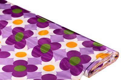 Satin "Blumen", Farbe: lila/flieder, Motivgröße: 11,5 x 11,5 cm, Breite: 145 cm, Gewicht: ca. 100 g/m². Material: 100 % Polyester.