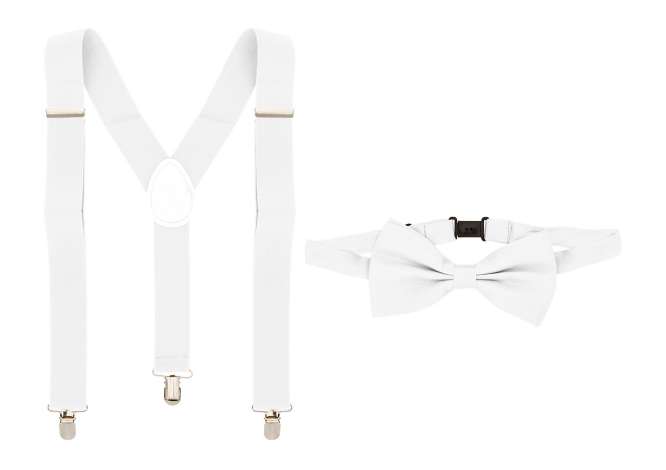 Set Hosenträger & Fliege – mit Hosenträger und Schleife in klassischem Weiß werten Sie Ihr Faschings- oder Mottoparty-Outfit ungemein auf!