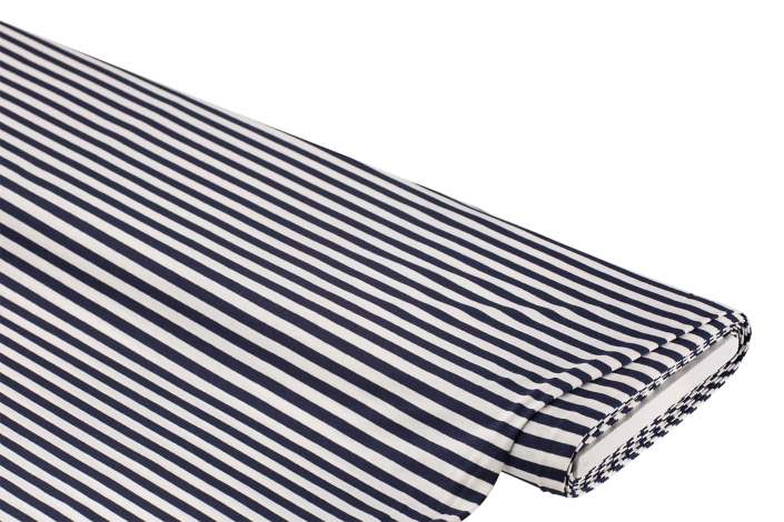 Viskose-Jersey "Streifen", Farbe: marine/weiß, querelastisch, Streifen quer verlaufend, Streifenbreite: 8 mm, Breite: 150 cm, Gewicht: ca. 170 g/m². Material: 95 % Viskose, 5 % Elasthan.